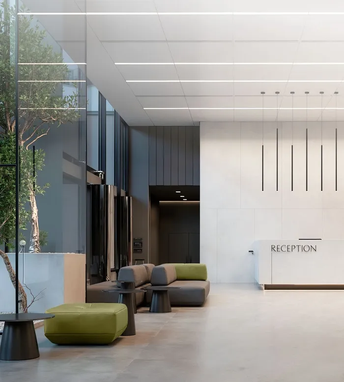 ЧЕТЫРЕ НЕЗАВИСИМЫЕ ВХОДНЫЕ ГРУППЫ С ДИЗАЙНЕРСКИМИ ЛОББИ И ПРОСТОРНЫМИ ЗОНАМИ ОЖИДАНИЯ.